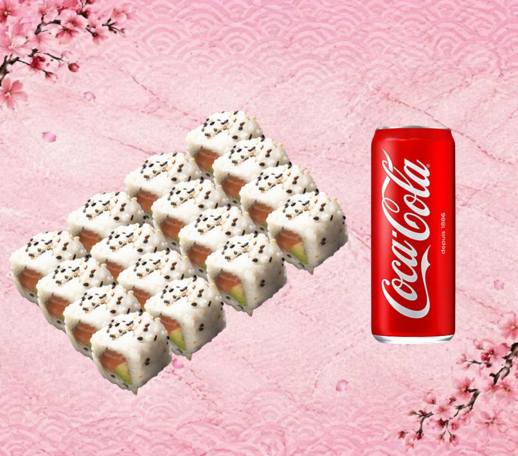16 California saumon avocat + boisson . Menu complet avec soupe et salade de choux .